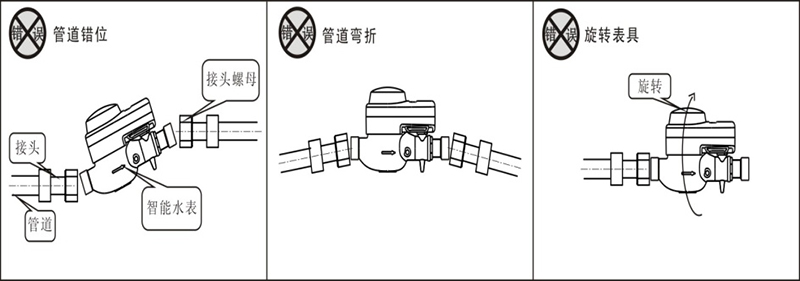將表接頭套入接頭螺母后安裝到管道上,然后扭轉(zhuǎn)接頭螺母將水表安裝到管道上,保持水表讀數(shù)度盤(pán)水平向上,水表與管道連接時(shí)不應(yīng)受過(guò)大的折彎力,以免損壞水表接口斷裂。禁止出現(xiàn)如下圖所示的安裝方式: