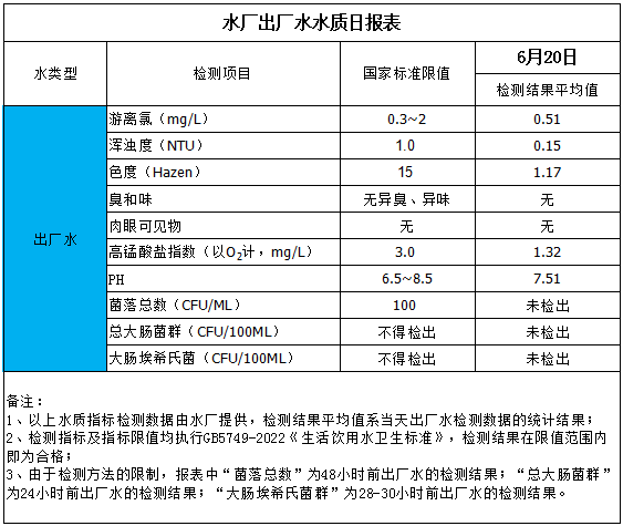 水廠出廠水水質(zhì)日?qǐng)?bào)表(2025-6-20)