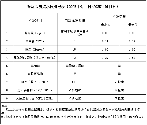 管網(wǎng)監(jiān)測點水質(zhì)周報表(2025年9月1日-2025年9月7日)