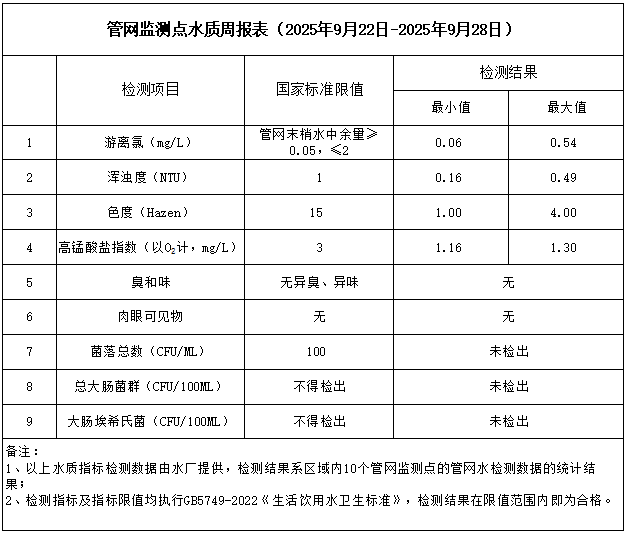 管網(wǎng)監(jiān)測點水質(zhì)周報表(2025年9月22日-2025年9月28日)