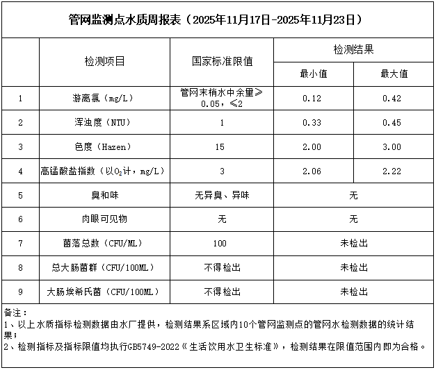 管網(wǎng)監(jiān)測點水質(zhì)周報表(2025年11月17日-2025年11月23日)