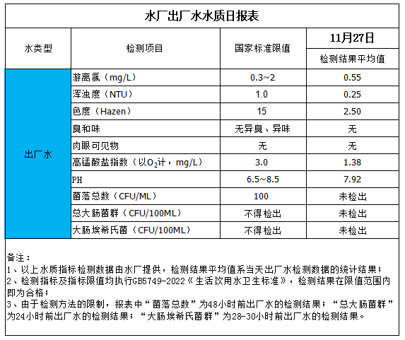 水廠出廠水水質(zhì)日?qǐng)?bào)表(2025-11-27)