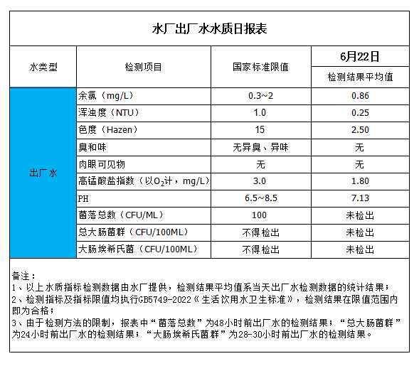 水廠出廠水水質(zhì)日?qǐng)?bào)表(2023-6-22)