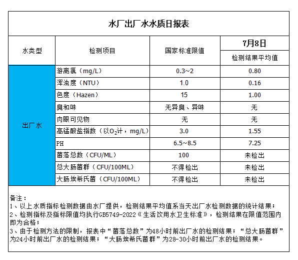 水廠出廠水水質(zhì)日報表(2023-7-8)