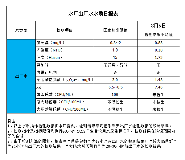 水廠出廠水水質(zhì)日?qǐng)?bào)表(2023-8-5)