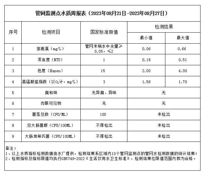 管網(wǎng)監(jiān)測(cè)點(diǎn)水質(zhì)周報(bào)表(2023年08月21日-2023年08月27日)