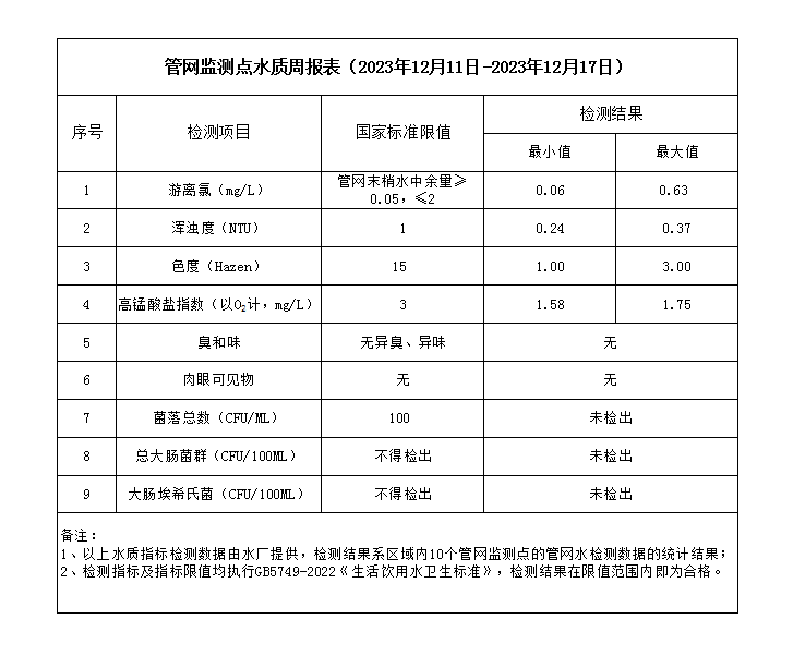 管網(wǎng)監(jiān)測點水質(zhì)周報表(2023年12月11日-2023年12月17日)
