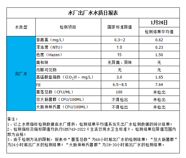 水廠出廠水水質(zhì)日報表(2024-1-24)