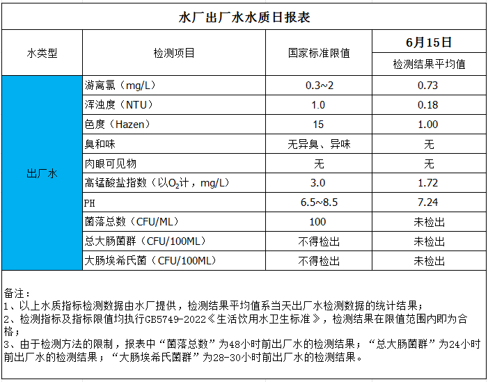 水廠出廠水水質日報表(2024-6-15)