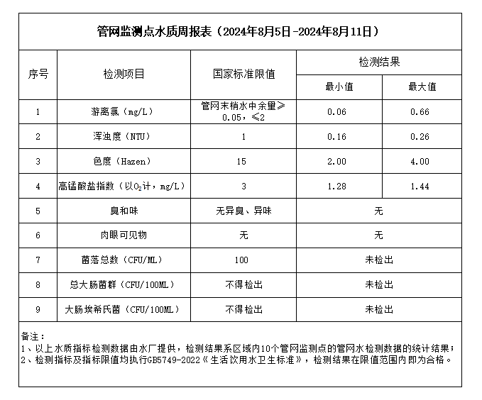 管網(wǎng)監(jiān)測點水質周報表(2024年8月5日-2024年8月11日)