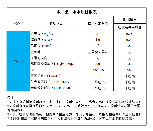 水廠出廠水水質(zhì)日?qǐng)?bào)表(2024-8-30)