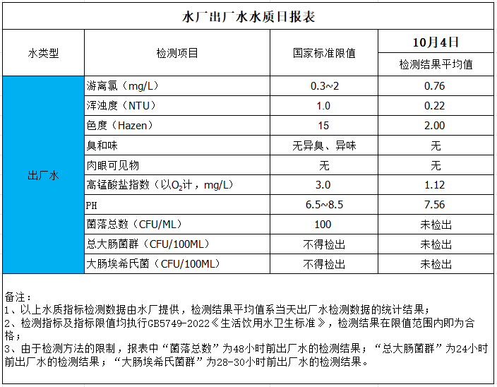 水廠出廠水水質(zhì)日報表(2024-10-4)