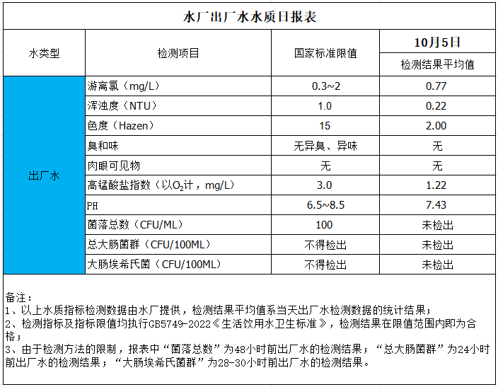 水廠出廠水水質(zhì)日?qǐng)?bào)表(2024-10-5)