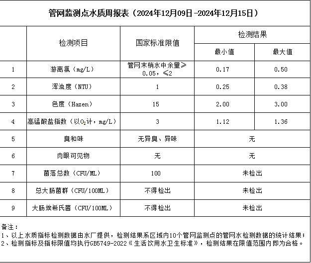 管網(wǎng)監(jiān)測(cè)點(diǎn)水質(zhì)周報(bào)表(2024年12月9日-2024年12月15日)