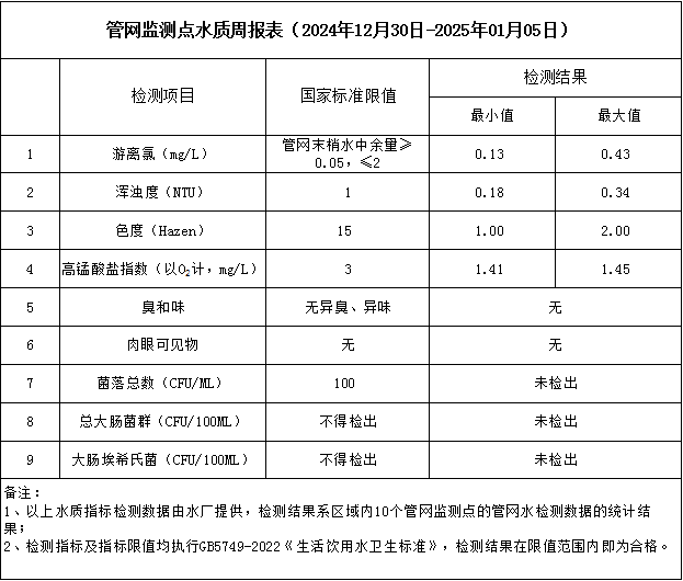 管網(wǎng)監(jiān)測點水質(zhì)周報表(2024年12月30日-2025年1月5日)